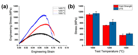 The engineering stress-strain curves from high temperature compression tests are shown in Figure 4. The sintered alloy showed the highest yield strength of 1136 ± 40 MPa at 1000 °C, followed by yield strength of 830 ± 60 MPa at 1200 °C, and finally yield strength of 425 ± 15 MPa at 1400 °C (Figure 4b). The high temperature compressive strength of W0.5(TaTiVCr)0.5 alloy was found to be more than twice that of pure W (~200 MPa at 1350 °C) [50], and higher than previously reported RHEA of NbMoTaW (548 MPa, 506 MPa and 421 MPa at 1000 °C, 1200 °C and 1400 °C, respectively) [51], TaNbHfZrTi (295 MPa and 92 MPa at 1000 °C and 1200 °C, respectively) [52], NbTaTiV (437 MPa at 1000 °C) [53], TaNbVTiAl (~360 MPa and 142 MPa at 1000 °C and 1200 °C, respectively) [54], and VCrFeTaW (182–371 MPa at 1000 °C) [55] due to solid solution strengthening and precipitation strengthening (from in-situ formed TiC phase) [42,56]. The decrease in the yield strength with increasing temperature can be related to the diffusion of Ti, as shown in Figure 3c [49]. The ductility was observed to increase from 6% to 10% with increasing temperature due to thermal softening [57], and Ti diffusion due to its low melting point. Furthermore, the yield strength of W0.5(TaTiVCr)0.5 alloy at all temperatures was found to be 3–4 times higher than the previous reported W-based heavy alloys [58,59].