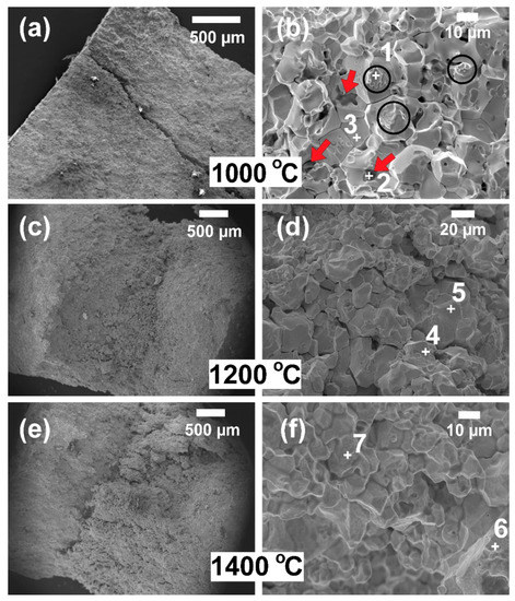 SEM micrographs of fractured surfaces from compression test at (a,b) 1000 °C, (c,d) 1200 °C, and (e,f) 1400 °C.