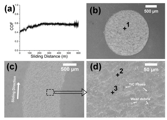 The high temperature sliding wear test of W0.5(TaTiVCr)0.5 alloy at 400 °C against alumina counterball was performed to study the wear behavior before the start of oxidation, as shown in Figure 6. The sliding wear test showed an average COF of 0.55 after an initial run-in period up to 200 m of sliding distance (Figure 6a). The alumina counterball showed a wear scar diameter of 2 mm arising from high wear induced by W0.5(TaTiVCr)0.5 alloy, as shown in Figure 6b. The EDS analysis on alumina counterball showed mostly W transfer layer (spot 1 in Table 4). The wear track morphology of W0.5(TaTiVCr)0.5 alloy is shown in Figure 6c,d. The sliding wear showed mild adhesive wear behavior and high amount of alumina counterball transfer, as shown in EDS data of spot 2 and 3 in Table 4. The sliding wear of W0.5(TaTiVCr)0.5 alloy against alumina counterball resulted in an average wear rate of 1.37 × 10−5 mm3/Nm, which was found to be three times lower than the wear rate of pure tungsten (5 × 10−5 mm3/Nm) at 500 °C as reported by Jiang et al. [63]. Recently, Zhou et al. developed a (FeCoCrNi)1−x(WC)x (x = 3–11, at. %) composite HEA using SPS to increase the wear properties of FCC based HEA [64]. The study showed enhancement of wear resistance up to 5 at. % WC addition against GCr15 steel counter ball. However, the wear resistance decreased for higher WC content due to lower bonding between reinforcement and HEA matrix phases. In contrast, formation of in-situ TiC reinforcement in HEA matrix has been found to be better for the wear resistance [65,66,67]. The formation of in-situ carbide reinforcement enhances the mechanical and tribological properties due to stronger bonding between the ceramic reinforcement and metal matrix [68]. Similarly, in this work, formation of in-situ TiC reinforcement, as marked in Figure 6d, coupled with the high hardness (788 HV [36]) from BCC solid solution in W0.5(TaTiVCr)0.5 alloy enhanced the wear resistance even at 400 °C.
