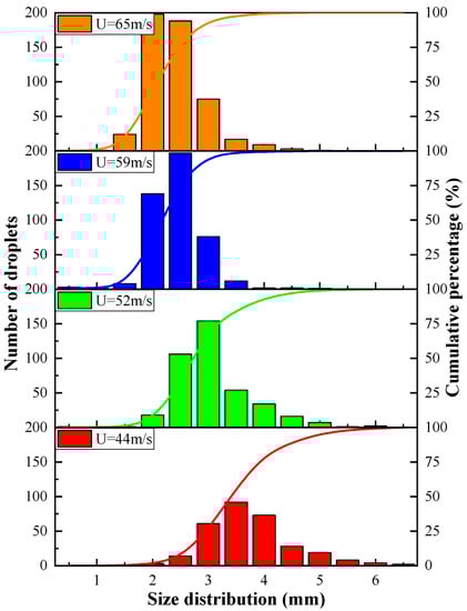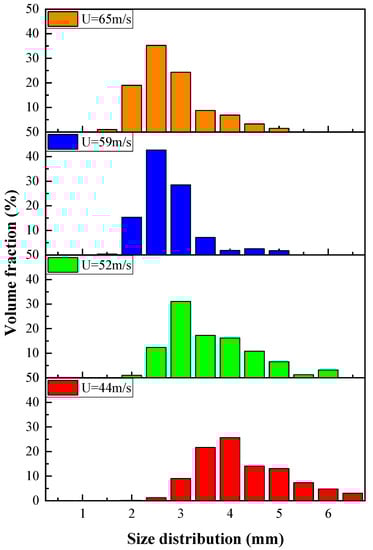 The typical size distribution of droplets in the emulsified region of a water–oil bath is shown in Figure 2. The increase in gas velocity leads to a decrease in emulsion droplet size. There are many large droplets (over 4 mm in diameter) in the emulsion layer when gas velocity is small. While with the gas velocity gradually increasing to 59 m/s, the percentage of small droplets in the emulsified region also increases. However, the droplet size distribution does not change obviously with a further increment in gas velocity, which is consistent with the conclusions of Khajavi et al. [17]. It also can be found that most droplet sizes are concentrated in the range of 2 mm to 4 mm for all cases.