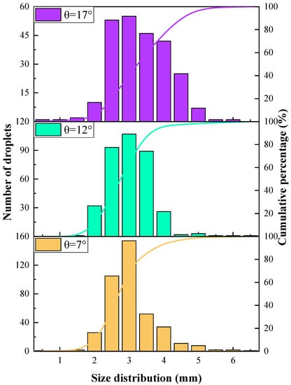 The increase in the injection angle (θ) results in the wider distribution of droplet size and a higher proportion of large-size emulsified droplets, as shown in Figure 4. A large injection angle means that the injected gas is more perpendicular to the water–oil interface (shown in Figure 1). This will cause local intensive fluctuations in the water–oil interface. Bubbles can move deeper into the bath and larger droplets of water will be carried up into the emulsified region, which is also found in the investigations of Song et al. [19]. The increase in the volume fraction of the dispersed phase leads to the increment in the effective collision number among droplets, creating large-size emulsified droplets. Moreover, when the injection angle increases, most of the input energy is transferred to the bottom of the bath, while the shear force in the horizontal direction is weakened, which also leads to an increase in droplet diameter. This result is consistent with the conclusions of Koch et al. [18].