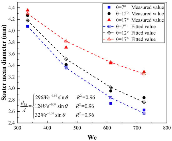 Dimensionless correlations of Sauter mean diameter with Weber numbers are also analyzed to predict the droplet size in the emulsified region with the high-strength gas injection. The values obtained from Equation (6) are compared with the experimental data, which yield a good match, as shown in Figure 5. The data shows that the droplet size is negatively correlated with the Weber number. The dimensionless correlations can be used to predict the emulsified droplet size under different operating conditions.