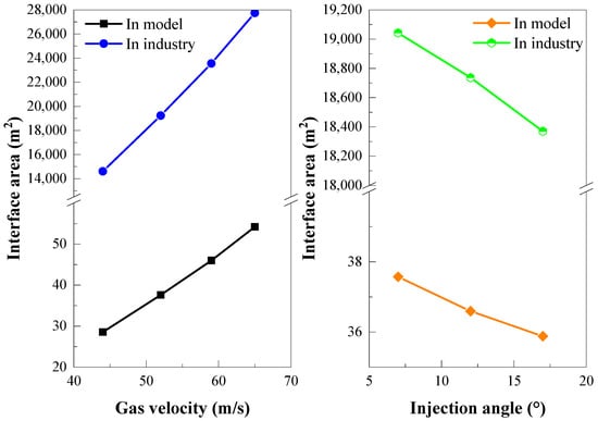 Figure 8 illustrates the interfacial area in both models and practices obtained by Equations (9) and (10). The interfacial area of the emulsified region in the physical model increases dramatically with the increase in gas velocity, reaching 54 m2. However, with the increment of the injection angle, the interfacial area decreases slightly. It can be seen that gas velocity is the most critical parameter affecting the interfacial area. In addition, when the physical model is scaled up to the industrial scale, the interfacial area could be up to 27,000 m2. Therefore, from the perspective of chemical reaction kinetics, the formation of emulsion droplets and the control of size distribution are significant factors to accelerate the copper smelting process and improve the efficiency of trapping noble metals.