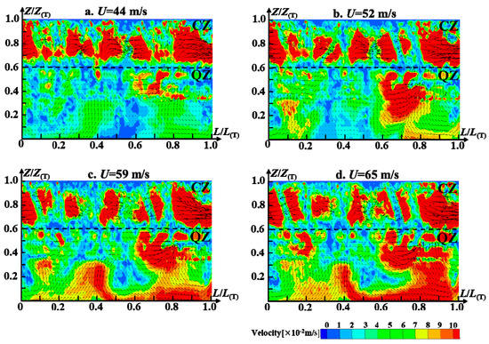 Flow patterns under different gas velocities. (CZ: Chaotic zone; QZ: Quiet zone).