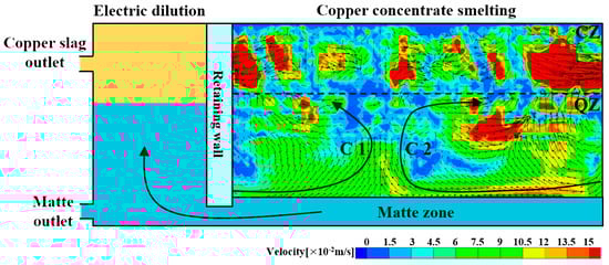 The retaining wall between the smelting part and the electrical dilution part has a good blocking effect on the horizontal movement of the fluid (as shown in Figure 9 and Figure 10), causing the fluid to move towards the quiet zone and preventing the fluid from moving further into the dilution furnace. The proposed height of the retaining wall should be from the top of the smelting furnace to the copper matte layer (shown in Figure 10). It not only prevents the melt from flowing directly into the dilution area but also forces emulsion droplets in the melt to contact with the copper matte layer.