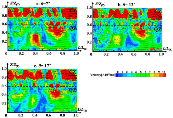Figure 11 compares the flow states of the melt at three injection angles. The flow patterns turn to be more turbulent with reducing the injection angle. For the quiet zone, there are also two large-scale circulations at the central region of the melt, which dominate the melt flow. With the increase in the injection angle, the energy transferred to the central region decreases gradually. When the angle is 7°, the melt velocity at the junction of the two circulations is about 0.1 m/s. While when the angle increases to 12° and 17°, the fluid flow velocity decreases greatly. Therefore, it is suitable to choose a small injection angle in actual production, which is consistent with the analysis in Section 3.2.
