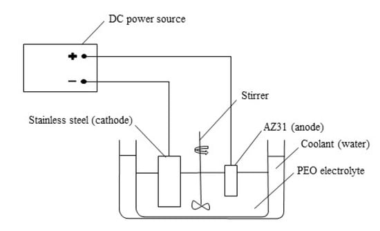 Prior to PEO treatment, samples of AZ31 alloy have been ground by an emery paper p1000. PEO coating has been prepared in a phosphate-based electrolyte bath consisting of Na3PO4·12H2O and KOH dissolved in deionized water having a pH of 12.5 ± 0.3. For the PEO coating preparation, a two-electrode system has been used consisting of the AZ31 alloy connected as an anode and a stainless-steel plate connected as a cathode to a Keysight N8762A (USA) DC power source. A constant distance of 10 cm between electrodes has been set during the coating fabrication, and a laboratory stirrer (Heidolph Instruments, Schwabach, Germany) has been employed to enhance the reactants distribution relative to the sample’s surface. The temperature of the coating bath has not exceeded 50 °C. This has been possible making use of a water-cooling system. The scheme of apparatus set-up is shown in Figure 1 [29,38]. With the aim to optimize processing parameters, the effect of two variables that are known to have a significant role in PEO process has been studied: the effect of electrolyte concentration and the effect of applied current density. Concentrations of Na3PO4·12H2O with a value of 8, 10, 12 and 15 g/L have been examined, and current densities of 0.025, 0.05, 0.1 and 0.15 A/cm2 have been applied to the sample for each electrolyte. The concentration of KOH has been set for all of the electrolytes at 1 g/L. The time of PEO treatment has not change and been set to 10 min.