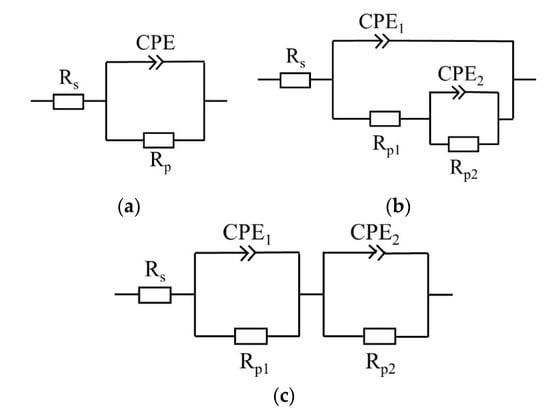 Electrochemical impedance spectroscopy (EIS) has been used for corrosion testing with the aim to quantify corrosion resistance of PEO coatings and describe corrosion mechanisms that occurred when samples have been in contact with in 0.1 M NaCl [39,40]. The sample’s area exposed to electrolyte has been 1 cm2. The time of exposure in solution has been set from 1 h up to 168 h at the temperature of 22 ± 2 °C. EIS experiments have been performed on 5-channel laboratory potentiostat VSP Bio-Logic (Bio-Logic SAS, Seyssinet-Pariset, France) with the frequency range from 100 kHz to 10 mHz with the change of frequency set to 10 times per decade using three-electrode cell system [41,42]. The amplitude of applied sinusoidal potential has been set to 15 mV, and the mean value has been identical with the value of open circuit potential (OCP) after each particular time of exposure. Nyquist diagrams have been analyzed by equivalent circuit technique using the EC Lab 10.42 software (Bio-Logic SAS, Seyssinet-Pariset, France) [43,44]. Schemes of used circuits are shown in Figure 2. A simple Randles circuit used to analyze diagrams with one capacitive loop is shown in Figure 2a. More complex circuits displayed in the Figure 2b,c have been used for analysis of diagrams with two capacitive loops and they describe occurrence of areas with different electrochemical behavior which could refer to the coating/corrosion products layer (first loop) and the existence of particular sub-layer or presence of double layer on a surface. In presented circuits, element Rs stand for solution resistance, and CPE represents constant phase element. Detailed description of elements employed in the circuits and their function could be found elsewhere [45,46,47,48]. The most important element from a corrosion point of view is ascribed as Rp—polarization resistance. It describes the impedance of the measured system, and it is in direct relation with the corrosion resistance of the measured surface [45]. Due to the high extent of measured data, only values of Rp, which are the most relevant factor for evaluation of corrosion resistance, are given. Complete measured Nyquist impedance spectra for each combination of electrolyte and current density are stated in Supplementary files (Figures S1–S4).