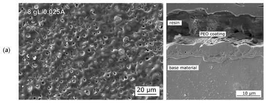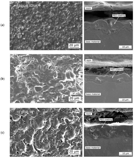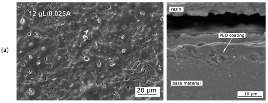 The aim of the study has been to optimize the preparation process of PEO coatings and to study the effect of processing parameters on surface properties of magnesium alloy AZ31. According to the SEM images of PEO coatings (Figure 3, Figure 4, Figure 5 and Figure 6), it is clearly visible that all of the combinations of electrolytes and current densities have resulted in porous structures and with the presence of microcracks. These features are connected with the nature of PEO process. At the beginning of PEO process, with constant applied current, voltage and resistance increase with the increasing thickness of the coating. After reaching critical voltage, breakdown of the coating takes place, and discharges start to occur on the surface. The temperature of discharges is high enough (typically thousands of centigrade degrees) to melt already created layer of oxides. Melted oxide flux flow out similarly to the “lava” effect observed in volcanic eruptions. This process is repeated several times, and coating gradually increases its thickness [49,50,51]. Places through which the discharges responsible for the distribution of melted flux passed the oxide layer represent pores when the melted flux is cooled down. Another origin of pores can be explained by entrapped gas bubbles that have been continuously evolved during the PEO process. Microcracks within PEO coating are consequences of internal stresses created when melted oxides are in contact with cold electrolyte. Cross section morphologies reveal that all of the prepared coatings contains sublayers, which determine mechanical and electrochemical properties of PEO coatings [52,53].