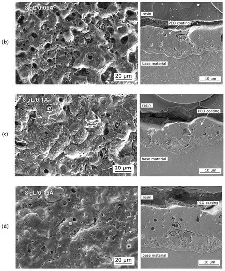 The Figure 3a–d shows the top surface and cross section morphology of the PEO coating prepared in the electrolyte with 8 g/L of Na3PO4·12H2O using different current densities. The thickness of the particular layers and values of roughness parameters are given Table 3. As can be seen, typical porosity and the presence of microcracks could be considered as general common features of the layers. On the other hand, there is a direct relation between applied current density and diameter of the pores. With a higher current, one gets larger pores; however, the number of pores are less when compared to lower currents. It can be also seen that thickness of the coatings and roughness parameters Ra and Rz have increased with an increased applied current, although, there is no significant difference between 0.05 and 0.1 A/cm2.