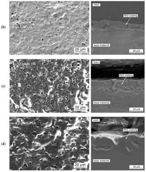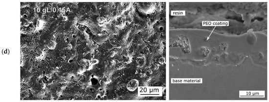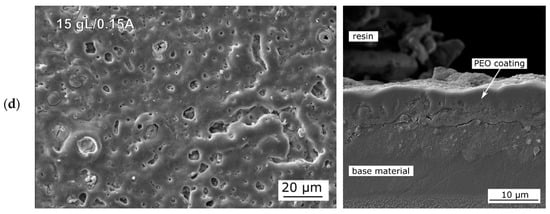 When compared to the PEO coating fabricated in electrolytes with lower phosphorus content, morphologies of the PEO coatings originated from electrolyte prepared using 15 g/L of Na3PO4·12H2O (Figure 6a–d) reveal that increase of phosphorus content to 15 g per liter has led to the increased diameter of the pores, but the number of pores has not been reduced. Moreover, significant cracks could be observed in the cross-section image of PEO coating prepared with the highest applied current density (Figure 6d). The thickness of the coatings prepared in 15 g/L (Table 6) electrolyte appears to be lower when compared to those prepared in 12 g/L (Table 5), and also, parameters of the roughness (Ra and Rz) are lower compared to the previous concentration of electrolyte.