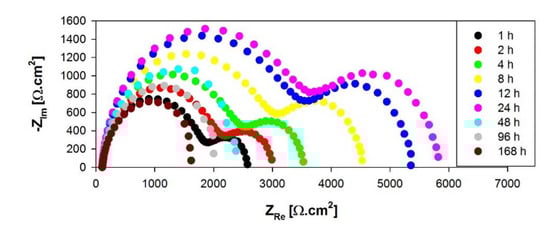 The layer prepared at 0.025 A/cm2 has exhibited a continuous decrease of RP, with exception observed after 24 h, to 8699 Ω.cm2 after 168 h (Figure 10b, Table 10). Significantly higher Rp (133,420 Ω.cm2) has been reached compared to the previous case after the increase of applied current to 0.05 A/cm2 (Figure 10a, Table 10). The decrement of RP has been disrupted after 12 h by the increment of resistance towards 28,053 Ω.cm2. This value has not markedly changed until 96 h of exposure when Rp of 17,428 Ω.cm2 has been detected. At the end of exposure, coating has reached almost 2-times higher Rp (14,489 Ω.cm2) compared to coating with lower applied current density. Coating prepared using 0.1 A/cm2 has reached higher Rp values compared to the previous one from the beginning of exposure up to 8 h and exhibited the RP of 10,032 Ω.cm2 after 168 h. Continuous decrease of Rp has been observed also in the case of the coating prepared with 0.15 A/cm2. It has reached the lowest values compared to previous three coatings with the final Rp of 5872 A/cm2.