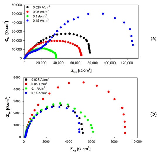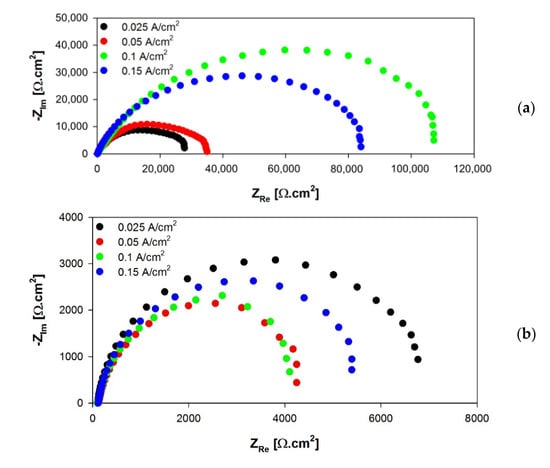 Figure 8 shows Nyquist diagrams for PEO coatings prepared in the electrolyte with 8 g/L of Na3PO4·12H2O with four different applied current densities after 1 h (a) and 168 h (b). The Rp of the coating prepared using 0.025 A/cm2 (Table 8) has dropped by two thirds after 2 h of exposure from initial 76,821 Ω.cm2 to 18,486 Ω.cm2 and consequently varied around 10 kΩ.cm2. After 48 h of exposure, another drop of Rp of about 50% has been detected (4043 Ω.cm2) followed by a continuous increase of resistance up to 5878 Ω.cm2. Coating fabricated with 0.05 A/cm2 has exhibited a lower value of initial Rp (66,299 Ω.cm2) compared to the previous one. A significant Rp decrease has been observed after 4 h of exposure. Consequently, Rp has risen (except 12 h) up to 18,047 Ω.cm2 reached after 48 h. As the exposure has proceeded, resistance has decreased towards the value of 9439 Ω.cm2 recorded after 168 h. This value has been positively higher compared to the previous tested sample. An increase of Rp has been recorded in case of the coating prepared at 0.1 A/cm2 from the beginning of exposure up to 2 h. Except for 8 h, Rp has tended to oscillated around 15 kΩ.cm2 until 96 h where the decrease of Rp has been observed continuing to the final value of 6012 Ω.cm2. The highest applied current density has led to the highest obtained Rp of 139,285 Ω.cm2 after 1 h of exposure. A significant drop of resistance has been registered after 4 h. In the following exposure, a continuous decrease of Rp (except 12 h: 18,093 Ω.cm2) has been observed to the 4740 Ω.cm2 reached after 168 h. When comparing final values of Rp, it is obvious that the highest corrosion resistance has been reached by using a current density of 0.05 A/cm2.