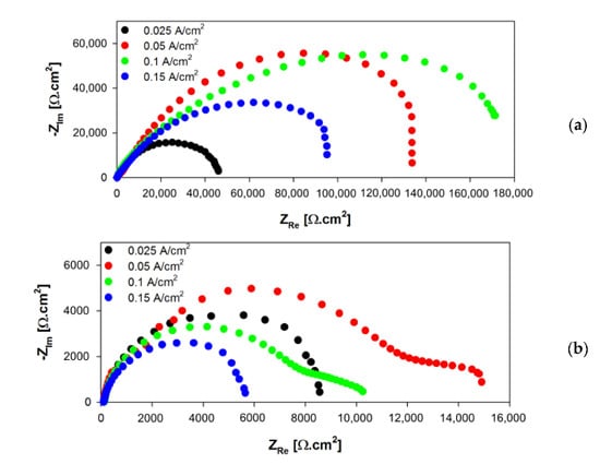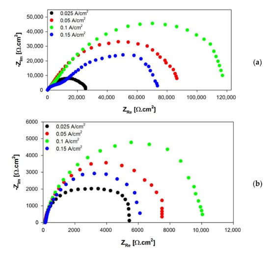 Nyquist diagrams of PEO coatings prepared in the electrolyte with 8 g/L Na3PO4 with different applied current densities after 1 h (a) and 168 h (b).