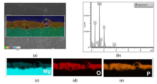 EDX analysis has been performed in order to evaluate the chemical composition of the coating prepared by 0.05 A/cm2 in the electrolyte containing 12 g/L of Na3PO4·12H2O. Results of analysis, EDX mapping and corresponding EDX spectra are shown in Table 12 and in Figure 12, respectively. Based on the mentioned values of chemical composition, it is obvious that coating consists of a mixture of elements released from electrolyte (P, O and Na) and elements originated from the substrate (Mg and Al) as well. This statement is supported by EDX mapping performed on a cross-section of PEO coating. It is also clear that elements with the highest amount (Mg, O and P) are uniformly distributed through the coating (Figure 12c–e).