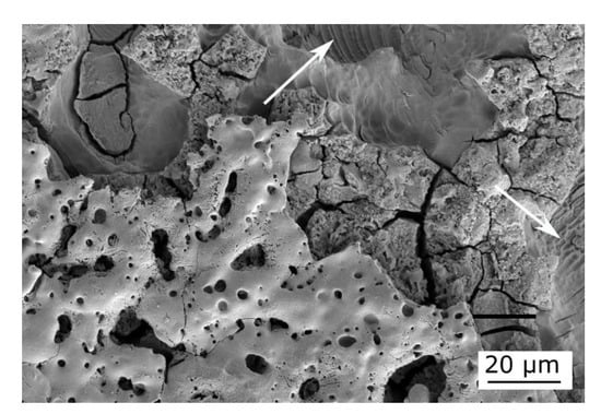 PEO coatings prepared in the electrolyte with the addition of 8 g/L of Na3PO4·12H2O have shown a trend of decreasing porosity with increasing applied current density. On the other hand, the diameter of the pores has increased when a higher current has been used [38]. This phenomenon could be explained by the amount of energy applied to the sample. The higher applied current has led to the higher voltage reached during the PEO process. Higher energy input has been followed by more intense and bigger discharges on the surface, which has led to an increased amount of molten material responsible for the creation of the coating. Such manner has caused accelerated growth of the coatings, which has been reflected by the measured thickness of the coatings and their roughness parameters (Table 3) as well. These findings are in good agreement with research published by [54], where authors have applied PEO on pure magnesium samples and found out that higher applied current has contributed to the creation of more compact and thicker coatings. Results of EIS measurements of all created coatings in electrolyte with the lowest addition of phosphorus have clearly shown the initial trend of decreasing Rp values with increasing time of exposure. When contact of the surface with NaCl electrolyte has been made, the liquid fills pores and cracks of the coatings, saturate and gradually penetrate through these defects towards the magnesium substrate. As time proceeds, delamination of thin parts between the pores takes place together with anodic dissolution of nonstable MgO, both leading to the failure of the whole pieces of the coating and consequent decrease of the coating thickness. This feature is illustrated in Figure 13 showing the PEO coating after 168 h exposure in 0.1 M NaCl. The arrows point to the visible dissolution traces of particular sub-layers proving the statement about the continuous dissolution of the coating, which is affected by aggressive chloride ions. It is also obvious that dissolution has led to the connection of pore areas and, therefore, to the increase of electrochemically active area.