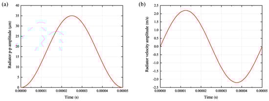 Analysis of calculated radiator movement: (a) actually calculated radiator amplitude and (b) velocity amplitude and frequency.