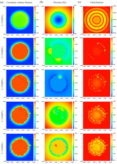 Development of the cavitation zone on the radiator’s surface at different times: (a) cavitation volume fraction, (b) pressure and (c) fluid fraction.