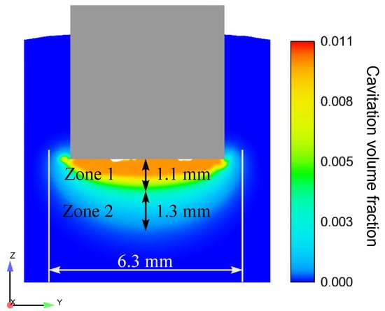 In addition to the cavitation volume fraction results shown in Figure 3a, the cavitation area dimensions in yz-layer in the cross-section of the sonotrode after t = 0.001 s are demonstrated in Figure 4. Starting from the radiator surface, the cavitation area also expands downwards. The cavitation area can thereby be divided in two zones: a primary zone (zone 1), where the cavitation activity is highest and a transition zone (zone 2) between zone 1 and the rest of the fluid, where the cavitation activity is continuingly decreasing to zero. Since the pressure amplitude decreases exponentially with growing distance to the radiator and cavitation dynamics are directly dependent on the pressure conditions, cavitation activity decreases as well.