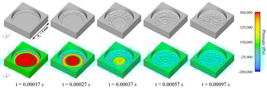 In addition to the results illustrated in Figure 3, the volume fraction distribution in and around emerging bubbles is calculated, as demonstrated in Figure 5. The displayed bubble in Figure 5a has a maximum size of four mesh cells, which corresponds to roughly 200 m, and forms and collapses within 30 s. Figure 5b shows the corresponding pressure values during bubbles’ expansion and compression and after bubble collapse. Until the final collapse, the bubble is surrounded by a negative pressure field, which adjusts to the pressure values of the rest of the fluid with increasing distance to the bubble. After the bubble vanishes or collapses (t = 0.000240 s), a short pressure hotspot occurs.