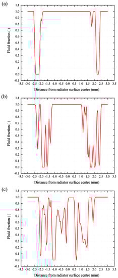Fluid fraction analysis on the radiator surface: (a) t = 0.00027 s, (b) t = 0.00037 s and (c) t = 0.00097 s.