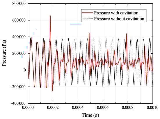 Since it is known that cavitation influences the acoustic pressure propagation and that it is an important factor for cavitation dynamics, the pressure oscillation with and without the activated cavitation model was analysed. Figure 8 shows the comparison of the pressure developments in the centre line 4 mm below the radiator. Without the activated cavitation model, pressure oscillates sinusoidally around the ambient pressure of almost 100,000 Pa regularly, and no abnormalities are registered; whereas with the activated cavitation model, considerable fluctuations in pressure values are perceptible. It can be concluded that the cavitation activity has a damping influence on acoustic pressure development and propagation, even if pressure eruptions higher than the normal pressure oscillation (without cavitation) occur, due to collapsing bubbles, were measured.