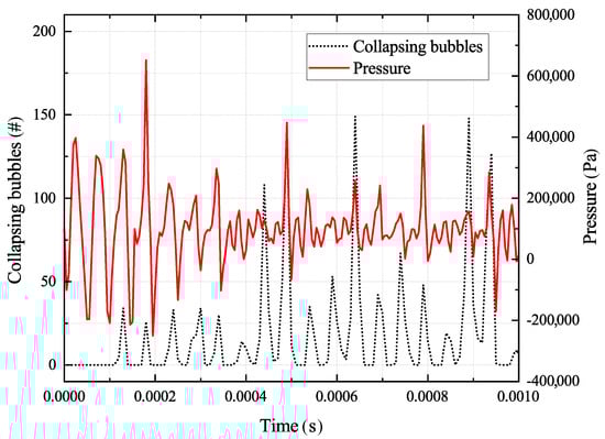 As already mentioned, the software is able to track collapsed bubbles via void particles as a quantitative measurement that fulfil the function of markers. Within the investigated time period (1000 s), one-thousand seven-hundred fifty-two collapsed bubbles were registered. Figure 9 demonstrates the overlay of collapsing bubbles with the corresponding pressure values at that exact moment. It reveals that the collapse activity increases and decreases the more the positive pressure amplitude nears and leaves its local peak. Nearly all collapses take place close to the radiator surface; collapsing activity decreases with increasing distance to the radiator.