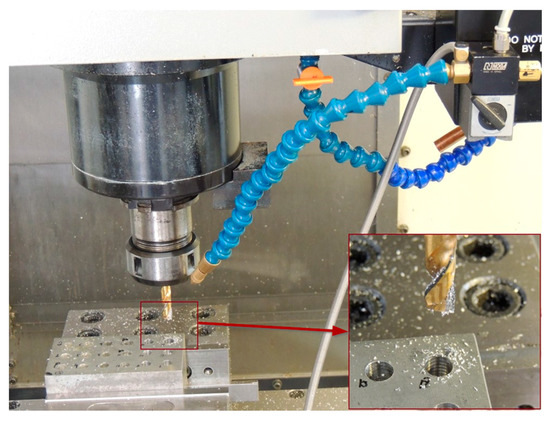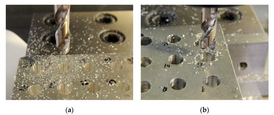 Drilling operations were carried out enlarging some previous blind holes of 7.75 mm, up to a final diameter of 8 mm, which supposes a depth of cut of 0.125 mm. These conditions simulate the repair tasks in which they try to eliminate the minimum material, in order not to weaken the component. The drilling depth was 20 mm from the top surface of the specimen, performing a drilling cycle with the feed rate established and making the tool recoil quickly. After each of the individual tests, a photographic record was taken, and the work area was cleaned with compressed air.
