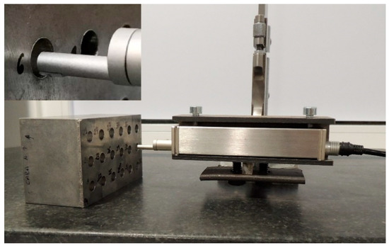 RSm. In addition to this, it is possible to export the measurement data to a computer, using the roughness tester software, creating a spreadsheet with these parameters and generating a graph with the roughness profile. To carry out the measurements, the roughness probe, which is portable, was grabbed by a special tool to a height gauge that us allows to position it at the desired height, placing the assembly, as well as the specimen on a surface plate, as can be seen in the