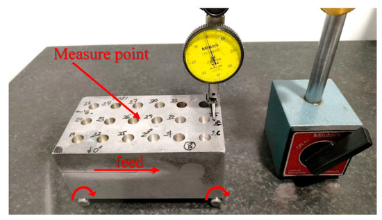 Figure 10, which are the result of the drill’s back movement. This statement is based, on the one hand, on the marks direction, which is compatible with the backward movement of the tool and, on the other hand, on the fact that the period does not coincide with the feed rate established in machining, but would be the maximum feed rate of the machine, which is the one used in the return movement of the tool in the CNC drilling cycle. Furthermore, spacing is similar regardless of other parameters, including feed rate.