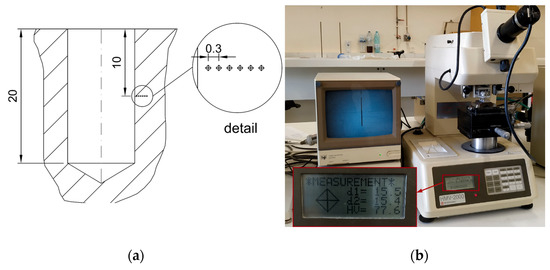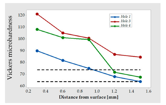 The Vickers hardness of the raw material was measured in areas sufficiently far from the machined holes, fluctuating the values between 64 and 75 HV. In addition, hardness measurement was performed at various distances from the machined surface, using the previously sectioned holes to obtain the metallographic images. The variations in the obtained hardness values are justified by the different phases presented in the alloy [