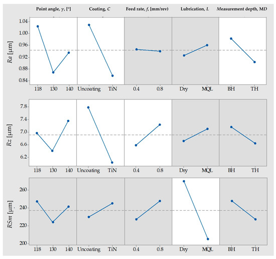 Ra measurements are below 2 µm and, therefore, the choice of the parameters of sampling length and evaluation length, previously established, is confirmed as correct. The minimum value was obtained for a combination of factors of drill point angle of 118° and TiN coating, and a feed rate of 0.4 mm/rev without lubrication in the top measurement height, being the value of 0.55 µm. Regarding each of the four measurements made at two heights from the upper surface in every individual hole, the