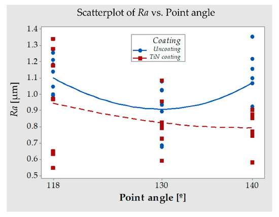 Regarding the drill point angle, the minimum roughness is obtained when its value is 130°, however, its behavior is different depending on the coating of the tool. When using uncoated drills, the response marks a minimum when using 130° angles; however, when using drills with TiN coating, the response is practically linear, reducing the roughness obtained by increasing the point angle used in the tool, as reflected in