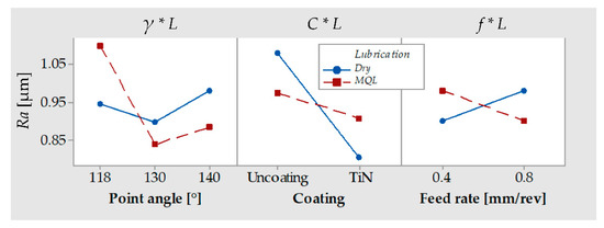 C * L, in which it is verified that when machining under dry conditions, the use of TiN coated drills significantly reduces roughness; however, when using MQL lubrication, this decrease is much less. One explanation would be that the lubricating effect of the MQL system would be of great importance in uncoated bits, whose coefficient of friction is greater, being the effect less in drills with TiN coating, in addition, as can be seen in