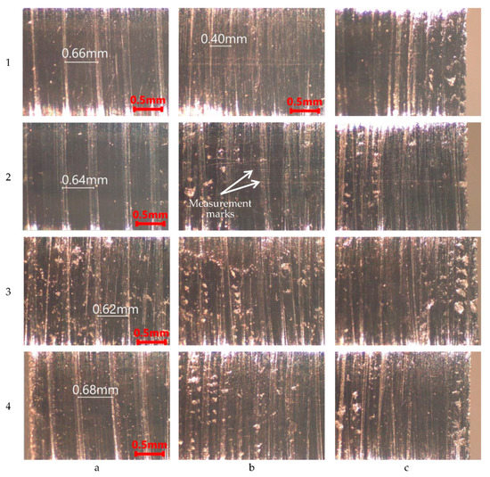 Figure 10, which coincides with the feed rate of 0.4 mm/rev, which corroborates the statement. The measurements of the distance between the marks are indicated in white, while the scale of the images appears in red in the lower right corner. Zone c is the zone near the upper surface, in which the marks of the feed rate predominate and where large marks can be observed, phenomena that will be called pitting.