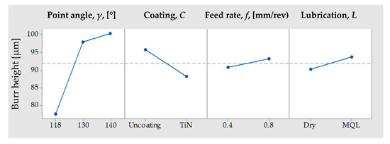 Regarding the burr height measurements, the influence of the main parameters used on the average value at the four points spaced 90°, at which it was measured on the drill entrance surface, are shown in