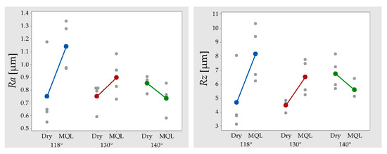 Ra values were obtained on the area closest to the top face of the specimen. The explanation for this behavior would be that as the drilling process deepens, it becomes more severe, due to the greater difficulty of evacuating the chips, the lesser evacuation of the heat generated and, in case the MQL lubrication system is used, the greater difficulty that the lubricant acts on the cutting area. This influence was found in previous works by Berzosa et al. [