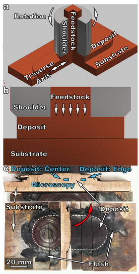 Alloy 110 Cu (also known as electrolytic tough pitch Cu) was used for both the feedstock and the substrate (McMaster-Carr, Douglasville, GA, USA). Samples from the feedstock were cut for microstructural characterization to provide a control comparison. The remaining feedstock was coated with graphite and then deposited onto the substrate at a nominal rotational speed of 4.58 Hz (275 rpm) and a nominal traversing speed of 2.12 mm/s (5 in/min) in four back-and-forth passes (approximately 1 mm tall each) using a B8 AFS-D machine (MELD Corporation, Blacksburg, VA, USA) with no shielding gas. No special preparation (e.g., sanding, polishing) of the substrate surface occurred, i.e., deposition occurred on the as-received surface finish. After removal from the AFS-D machine, the deposit/substrate was sectioned normal to the traversing axis (Figure 1c). The cross-sections were further cut for metallurgical mounting, then ground and polished to a mirror finish.