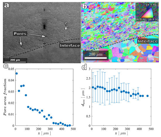 Microstructural evaluation of the substrate–deposit interface by scanning electron microscopy. (a) contains a secondary electron image of the substrate–deposit interface; the approximate location of the interface is marked with a dashed line. The coordinate axis z denotes distance from this interface into the deposit. (b) is an inverse pole figure map of the approximate region represented in (a). The interface is again marked with a dashed line, and the color scheme is shown in the inset at the top right. (c) shows the pore area fraction determined from (a) as a function of distance from the interface, z. (d) plots the average pore size as a function of distance from the interface, z. Error bars may be either omitted for z ranges having only one data point or obscured by the average value marker (filled circle).