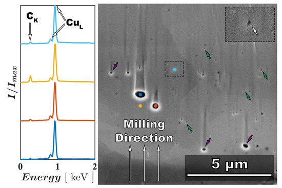 Though pores could be attributed to oxide pull out during mechanical polishing, this was confirmed not to be the case, Figure 3. Using a focused ion beam (FIB), a trench was milled to reveal the nature of the defects. Since the ion milling directly cuts the material, pull-out of inclusions is mitigated. The milled surface reveals the porous structure, which enabled EDS point scans of these defects as well as the matrix. These results indicate that the only elements present are Cu and a small amount of C present (no O signal). The EDS scans are truncated in energy in order to effectively differentiate the Cu and C peaks at low energy; the higher energy portions of the spectra only have the CuK peaks. The OK peak, if it were present, would occur at approximately 0.5 keV. The detection of C via EDS indicates some retention of the graphite lubricant coating applied to the feedstock prior to deposition.