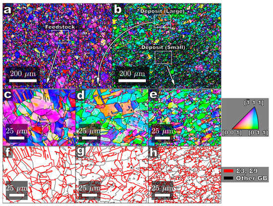 The microstructures of the feedstock and the deposit center are surveyed (at 150×) with EBSD in Figure 4a,b. Each scan used the same collection parameters and conditions to facilitate comparison between the resulting inverse pole figure maps. Visual inspection (Figure 4a,b) and grain size analysis (Table 1) indicate that deposition refines the grains, as observed in other materials [7,8,9,10]. Furthermore, the grain size refinement is not uniform throughout the deposit, with variance in the grain size depending on position within the deposit, as observed in Ref. [7]. To confirm the “survey” EBSD maps, we also conducted some EBSD scans at 1000× (Figure 4c–h). As the grain size was observed to be uniform from the feedstock EBSD survey scan, we only conducted one such 1000× scan for the feedstock, Figure 4c,f. For the deposit center, two 1000× scans were done in order to examine the largest (Figure 4d,g) and smallest (Figure 4e,h) grain size regions. For these 1000× scans, we plot an inverse pole figure map (Figure 4c–e) and a map of the twin/non-twin grain boundaries (Figure 4f–h) for each scan. The corresponding legends are found to the right of each row. In Appendix B, we plot the two types of maps, following Figure 4c–h, for the “survey” scans for completeness. The edge-of-the-deposit EBSD scans are shown in Figure 5. These were conducted at 800× magnification in order to adequately characterize the slightly larger average grain size at the edge. Similar to the deposit center, there are regions of larger and smaller grains at the edge.