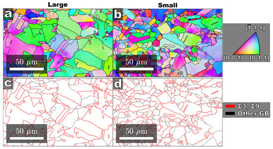 We plot the two types of maps resultant from the “survey” EBSD scans in Figure A2. The two types are inverse pole figure maps and twin/non-twin grain boundary maps. Figure A2a,b are repeated from Figure 4 to aid comparison.