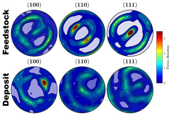 The textures of the feedstock and the deposit center are examined in Figure 6. From these pole figures, the feedstock has a near texture. While the deposit has a strong pole near , it does not appear to have a well defined texture otherwise.