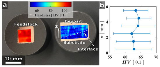 (a) Vickers hardness maps for the feedstock and the deposit (overlays are approximate). The maps are colored according to the same color-scale, shown above. The coordinate axis, z, defining the distance from the interface, is also marked; (b) variation in hardness of the deposit with respect to distance from the interface, z. The error bars represent standard deviations.