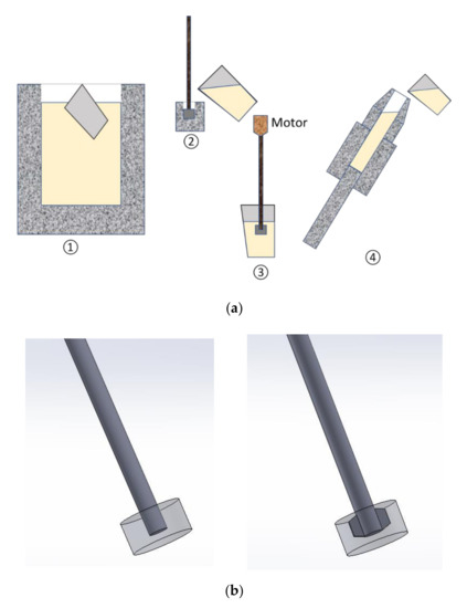 Schematic illustration of the slurry fabrication process with; (a) The RheoMetalTM process steps as ➀ Ladling, ➁ Casting the Enthalpy Exchange Material (EEM), ➂ Stirring in the solid EEM to make the slurry, ➃ Pouring the slurry into the shot chamber, and (b) Standard RheoMetalTM processing rod and EEM (Left) and Intense shearing set-up with wings added to the rod cast into the EEM body (right).