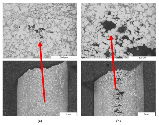 The observed microstructures for the two processing conditions are shown in Figure 2. The intense shearing has resulted in a near pore-free microstructure (Figure 2a). The white phase is primary precipitated α1-Al particles produced in the RheoMetal process, and the grey regions are a mixture of finer α2-Al particles/dendrites and the eutectic with Al, and Mg2Si. Figure 2b shows the same material processed using the conventional methodology with a higher gross porosity formed in the centre. Here, it should be noted that there exists in both cases, a nearly α1-Al particle-free outer layer as the slurry particle migrates inwards during filling [10,11]. It should also be noted that a strong shear band has formed under conventional processing (Figure 2b), and a tendency for the same is seen in Figure 2a [12]. These processes cause an agglomeration of the α1-Al particles in the central regions, which then will give rise to a slurry with a higher yield point of the slurry, provided that the microstructural morphology would allow for the required strength build-up to occur. The results in that the inner part would flow more like a plug, preserving structures from the slurry fabrication, with shear concentrated to the surface region with low viscosity.