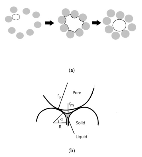 Illustration of the pore formation and profiling mechanisms: (a) Pore formation sequence with nucleation, precipitation and compression as well as the final stage of partial filling, and (b) Geometries illustrating conditions for pore filling, freely after [13].