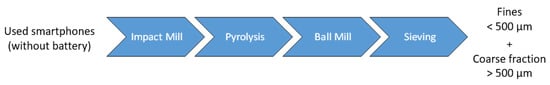 In a previous work [4], smartphones were identified as a suitable material for scientific activities that aim for recycling solutions with the potential to overcome the issues of highly complex waste streams. As a first approach, a combination of thermal treatment (pyrolysis) and mechanical processing was performed, resulting in the production of a carbon-rich fraction with a grain size of less than 500 µm. In addition to carbon and minerals, these pyrolysis fines contain increased amounts of a broad range of both base and trace metals. With respect to gallium, neodymium, dysprosium and gold, a significant enrichment of these elements in the fines was achieved. Figure 1 illustrates the chain of thermal and mechanical processes [4].
