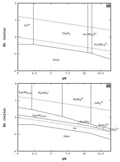 Ramos-Ruiz et al. [12] investigated the release of soluble gallium and arsenic from disposed GaAs into soil. In contrast to Kelly et al., Ramos-Ruiz et al. used gaseous O2 to oxidize GaAs. The authors found that an increase in the O2 concentration in the gas phase strongly facilitated the corrosion and dissolution of gallium and arsenic. They also confirmed the beneficial influence of a higher pH on the release of soluble species of both elements. Even at a pH between 6.7 and 8.5, a remarkable gallium dissolution was observed, which disagrees with their previous thermodynamic calculations as well as the Pourbaix plots in Figure 2. The authors supposed that bicarbonate in the solution could have acted as a complexing agent for gallium so that it also dissolved at a relatively low pH.