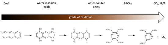 Aqueous oxidation of carbon and hydrocarbons is a matter of interest in the field of lignite processing where it can be applied to produce several kinds of aliphatic and organic acids. Due to the occurrence of aromatic compounds in lignite, high-temperature alkali–oxygen oxidation enables the decomposition and oxidation of those structures. The process is executed at elevated temperature and pressure using NaOH and gaseous oxygen or other oxidizing agents. Reaction products under these conditions are diverse benzene polycarboxylic acids (BPCAs) and aliphatic acids such as oxalic acid or acetic acid. These products are further used in the chemical industry [21,22,23]. The general evolution of reaction products during the alkali–oxygen oxidation of coal is depicted above the arrow in Figure 3. Underneath the arrow, the oxidative decomposition of anthracene is pointed out as an example [23].